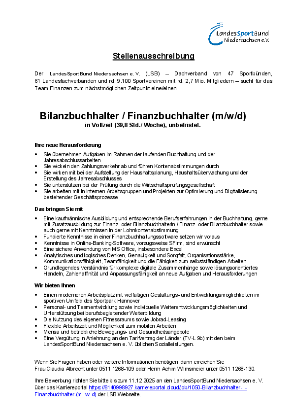 Ihre Bewerbung richten Sie bitte bis zum 11.12.2025 an den LandesSportBund Niedersachsen e. V. über das Karriereportal 8140998927.karriereportal.cloud/job/1050-Bilanzbuchhalter-_-Finanzbuchhalter-(m_w_d) der LSB-Webseite.