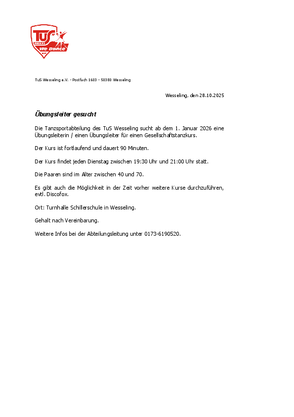 Die Tanzsportabteilung des TuS Wesseling sucht ab dem 1. Januar 2026 eine Übungsleiterin / einen Übungsleiter für einen Gesellschaftstanzkurs.