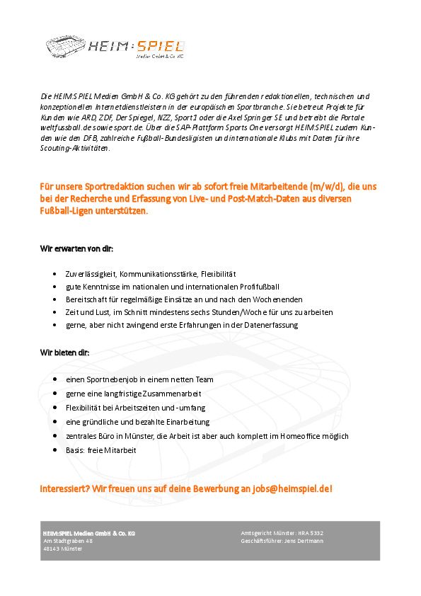 +++ Interessiert? Dann freuen wir uns auf deine Bewerbung an jobs@heimspiel.de! +++