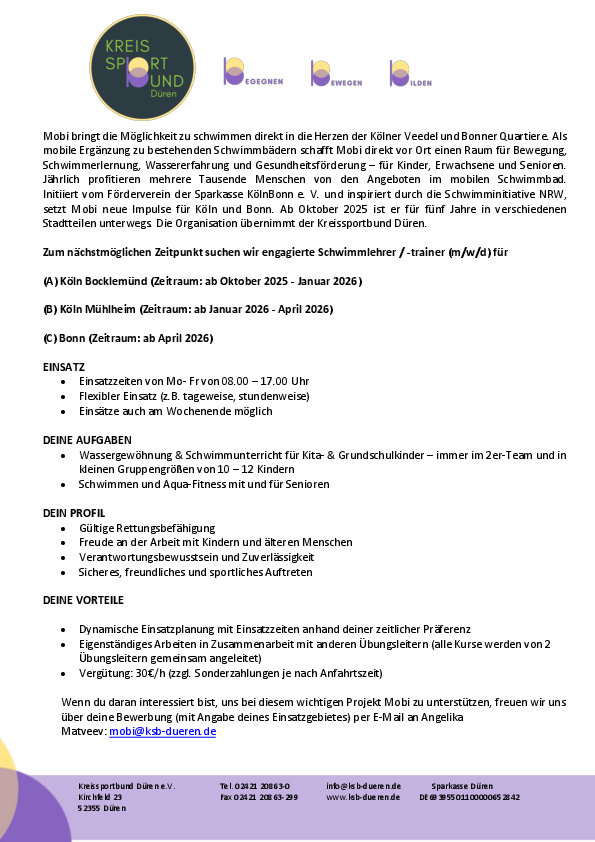Initiiert vom Förderverein der Sparkasse KölnBonn e. V. und inspiriert durch die Schwimminitiative NRW, setzt Mobi neue Impulse für Köln und Bonn. Ab Oktober 2025 ist er für fünf Jahre in verschiedenen Stadtteilen unterwegs. Die Organisation übernimmt der Kreissportbund Düren.