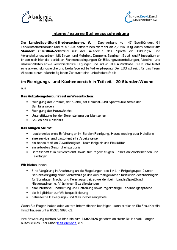 Der LandesSportBund Niedersachsen e. V. – Dachverband von 47 Sportbünden, 61 Landesfachverbänden und rd. 9.100 Sportvereinen mit mehr als 2,7 Mio. Mitgliedern betreibt am Standort Clausthal-Zellerfeld mit der Akademie des Sports ein Bildungs- und Veranstaltungszentrum. Mit Einzel- und Mehrbett-Zimmern, Seminar-, Sport- und Fitnessräumen finden sich hier die perfekten Rahmenbedingungen für Bildungsveranstaltungen, Vereins- und Klassenfahrten sowie verschiedenste Tagungen und individuelle Aufenthalte. Die Küche bietet eine abwechslungsreiche und bedarfsgerechte Vollverpflegung. Der LSB schreibt für das Team Akademie zum nächstmöglichen Zeitpunkt eine unbefristete Stelle
