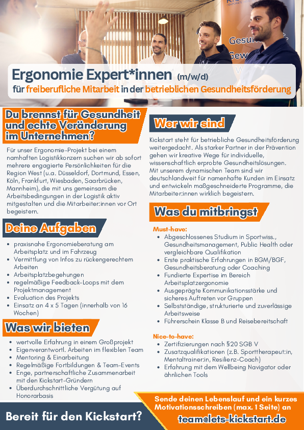 Kickstart steht für innovative betriebliche Gesundheitsförderung. Als starker Partner in der Prävention gehen wir kreative Wege für individuelle, wissenschaftlich erprobte Gesundheitslösungen. Mit unserem dynamischen Team sind wir deutschlandweit im Einsatz und entwickeln maßgeschneiderte Programme, die Mitarbeiter:innen wirklich begeistern.
