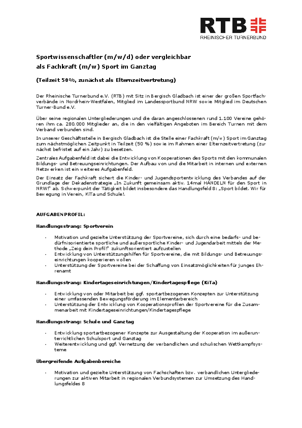 In unserer Geschäftsstelle in Bergisch Gladbach ist die Stelle einer Fachkraft (m/w) Sport im Ganztag zum nächstmöglichen Zeitpunkt in Teilzeit (50 %) sowie im Rahmen einer Elternzeitvertretung (zunächst befristet auf ein Jahr) zu besetzen.