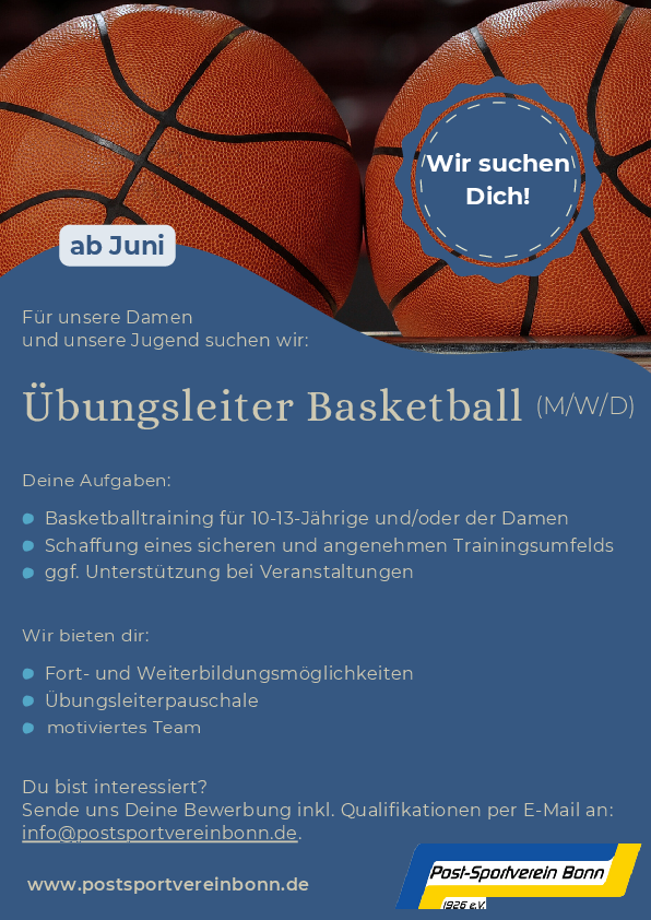 Sende uns gerne Deine Bewerbung inkl. Qualifikationen per E-Mail an: info@postsportvereinbonn.de.