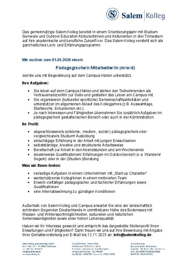 Am Salem Kolleg finden junge Erwachsene mehr als ihr Studium - sie finden Orientierung, Herausforderung, Gemeinschaft, Wachstum, Weitsicht und vieles mehr. Unterstützt werden die Teilnehmenden dabei von motivierten, qualifizierten und zugewandten Mitarbeitenden, für die ihre Tätigkeit mehr ist als ein Job. Möchtest auch du einen Teil zu dieser wertvollen Arbeit beitragen?