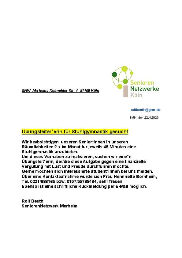 Das SeniorenNetzwerk Merheim möchte gerne in seinen Räumlichkeiten (Detmolder Str. 4, 51109 Köln), 2x im Monat für jeweils 45 Minuten eine Stuhlgymnastik anbieten.