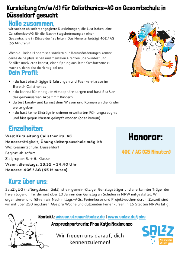 Wir suchen ab sofort engagierte Kursleitungen (m/w/d) für eine Calisthenics-AG an einer Schule in Düsseldorf.