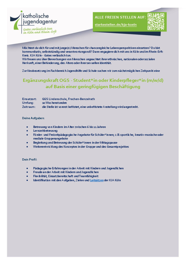 Ergänzungskraft OGS - Student*in oder Kinderpfleger*in (m/w/d) auf Basis einer geringfügigen Beschäftigung