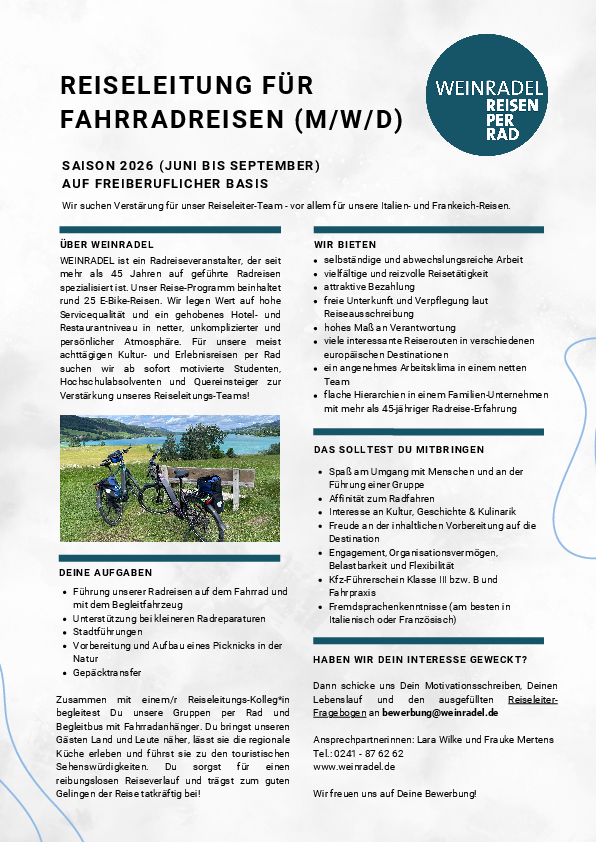 Für die Saison 2026 suchen wir vor allem Reiseleiter*innen für unsere Italien- und Frankreich-Destinationen im Zeitraum von Juni bis Anfang Oktober. Die Dauer einer Reise beträgt in der Regel acht Tage, evtl. plus An- und Abreisetage. Wie viele Reisen in der Saison betreut werden können, erfolgt in Absprache mit unserem Büro-Team. Obwohl es sich um eine saisonabhängige Nebentätigkeit handelt, suchen wir auch nach Reiseleiter*innen mit Interesse an einer langfristigen Zusammenarbeit.
