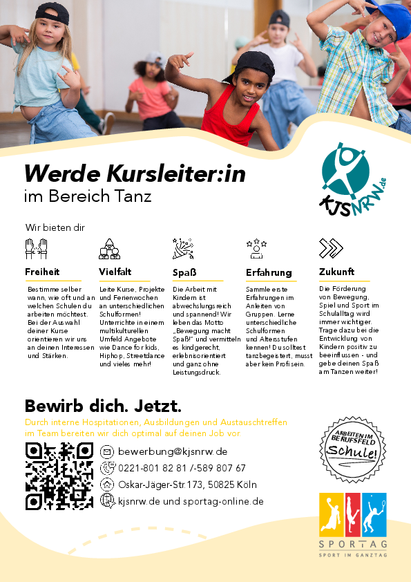 Wir suchen aktuell engagierte Kursleiter*innen, die nachmittags Tanzangebote in Grundschulen und/ oder weiterführenden Schulen im Großraum Köln übernehmen wollen.