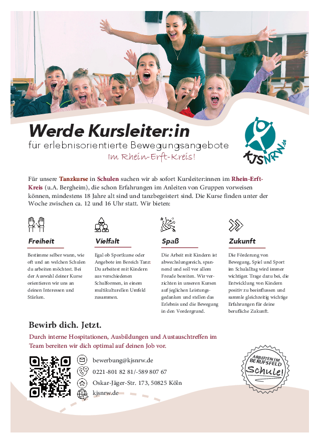 Wir suchen aktuell engagierte Kursleiter*innen, die nachmittags Tanzangebote in Grundschulen und/ oder weiterführenden Schulen im Rhein-Erft-Kreis übernehmen wollen.