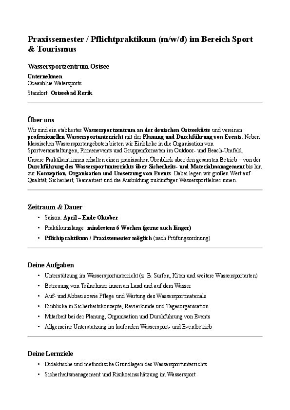 Das Praktikum ist als Pflichtpraktikum bzw. Praxissemester geeignet (Mindestdauer 8 Wochen / gerne länger) und bietet praxisnahe Einblicke in den professionellen Wassersportunterricht ,Unterstützung bei Managementaufgaben ,sowie in die Planung und Durchführung von Sport- und Outdoor-Events. Auch freiwillige Praktika sind willkommen.