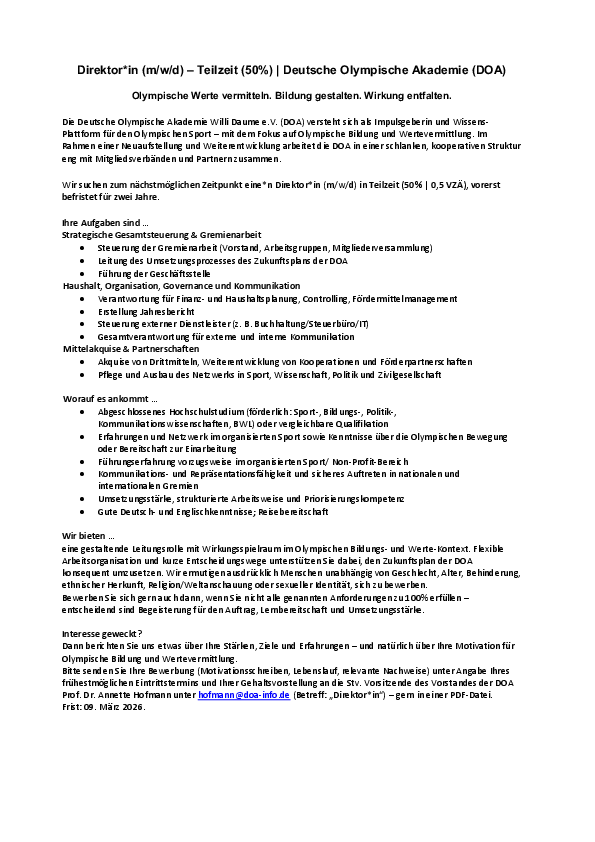 Die Deutsche Olympische Akademie Willi Daume e.V. (DOA) sucht zum nächstmöglichen Zeitpunkt eine*n Direktor*in (m/w/d) in Teilzeit (50% | 0,5 VZÄ), vorerst befristet für zwei Jahre.