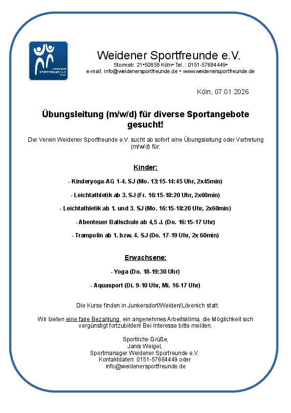 Der Verein Weidener Sportfreunde e.V. sucht ab sofort eine Übungsleitung oder Vertretung (m/w/d) für: