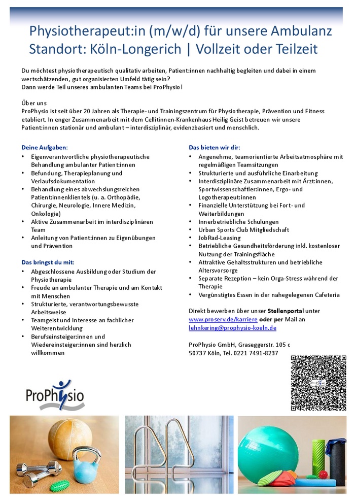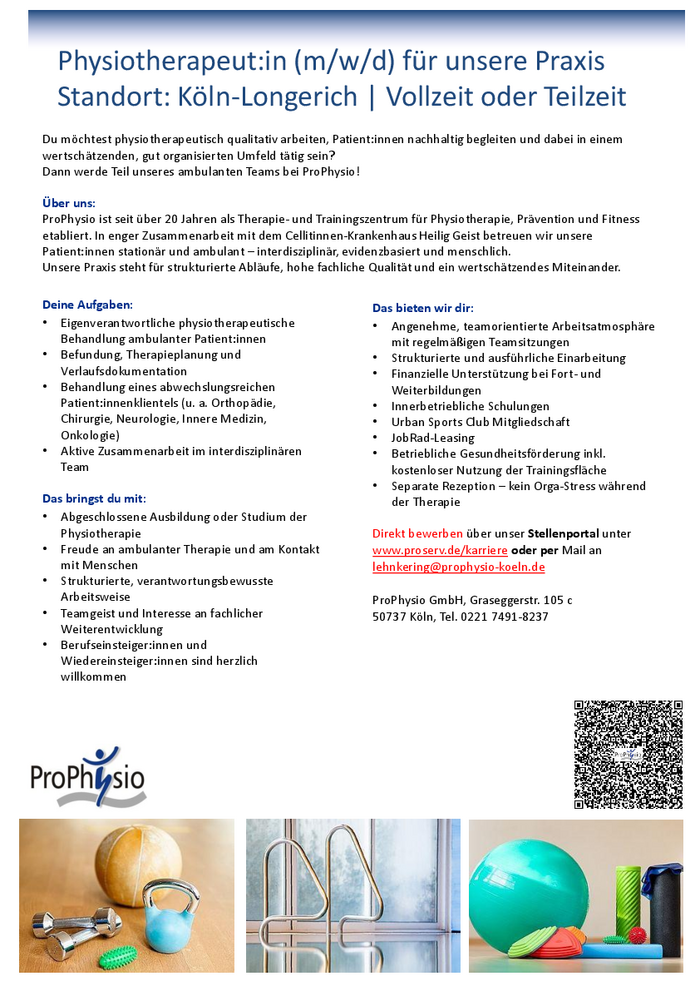 Direkt bewerben über unser Stellenportal unter www.proserv.de/karriere oder per Mail an lehnkering@prophysio-koeln.de