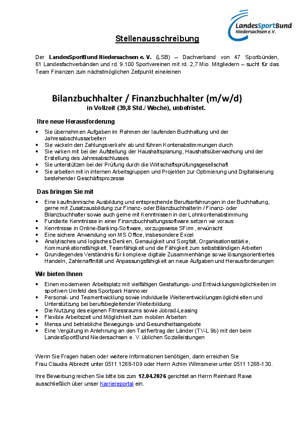 Bilanzbuchhalter*in / Finanzbuchhalter*in (m/w/d) beim LandesSportBund Nds. e. V.