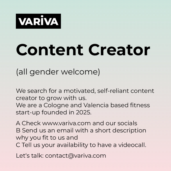 Cologne fitness start-up variva GmbH seeking for self-reliant content creator for our socials (IG, TT, FB). English proficiency mandatory, German and Spanish proficiency very welcome. Let's talk!