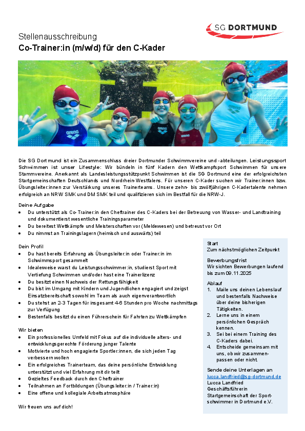 Die SG Dortmund ist ein Zusammenschluss dreier Dortmunder Schwimmvereine und -abteilungen. Leistungssport Schwimmen ist unser Lifestyle: Wir bündeln in fünf Kadern den Wettkampfsport Schwimmen für unsere Stammvereine. Anerkannt als Landesleistungsstützpunkt Schwimmen ist die SG Dortmund eine der erfolgreichsten Startgemeinschaften Deutschlands und Nordrhein-Westfalens. Für unseren C-Kader suchen wir Trainer:innen bzw. Übungsleiter:innen zur Verstärkung unseres Trainerteams. Unsere zehn- bis zwölfjährigen C-Kadertalente nehmen erfolgreich an NRW SMK und DM SMK teil und qualifizieren sich im Bestfall für die NRW-J.