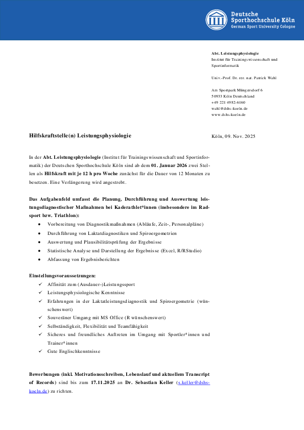 In der Abteilung Leistungsphysiologie (Institut für Trainingswissenschaft und Sportinformatik) der Deutschen Sporthochschule Köln sind ab dem 01. Januar 2025 zwei Stellen als Hilfskraft mit je 12 h pro Woche zu besetzen.