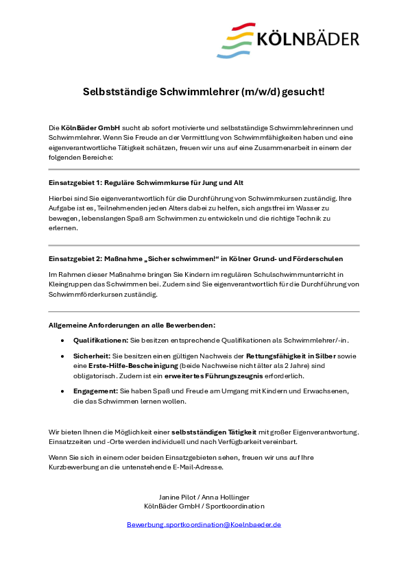 Die KölnBäder GmbH sucht ab sofort motivierte und selbstständige Schwimmlehrerinnen und Schwimmlehrer. Wenn Sie Freude an der Vermittlung von Schwimmfähigkeiten haben und eine eigenverantwortliche Tätigkeit schätzen, freuen wir uns auf eine Zusammenarbeit in einem der folgenden Bereiche:________________________________________