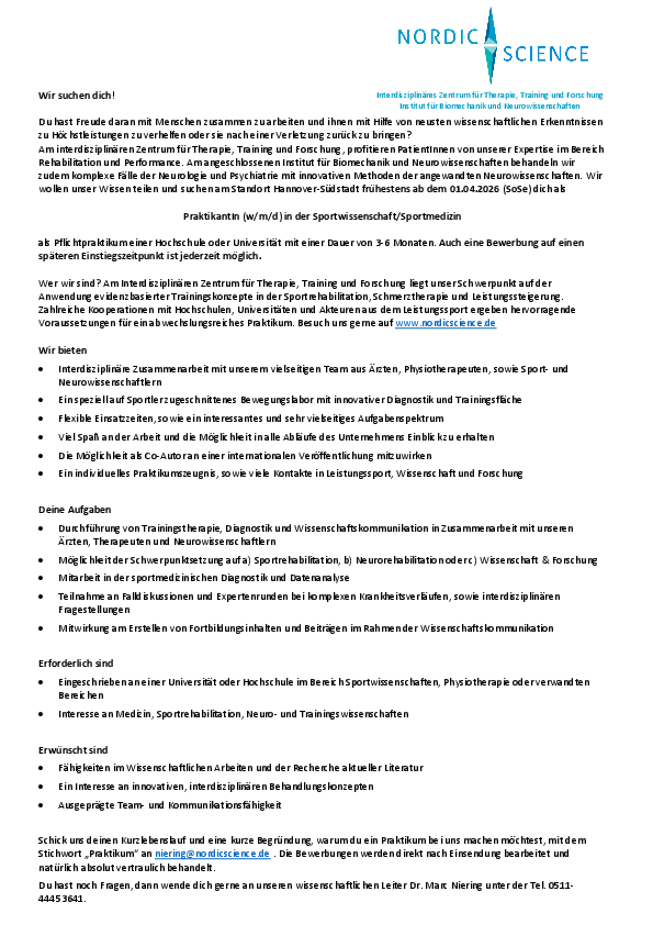 Am interdisziplinären Zentrum für Therapie, Training und Forschung, profitieren PatientInnen von unserer Expertise im Bereich Rehabilitation und Performance. Am angeschlossenen Institut für Biomechanik und Neurowissenschaften behandeln wir zudem komplexe Fälle der Neurologie und Psychiatrie mit innovativen Methoden der angewandten Neurowissenschaften. Wir wollen unser Wissen teilen und suchen am Standort Hannover-Südstadt frühestens ab dem 02.02.2026 dich als