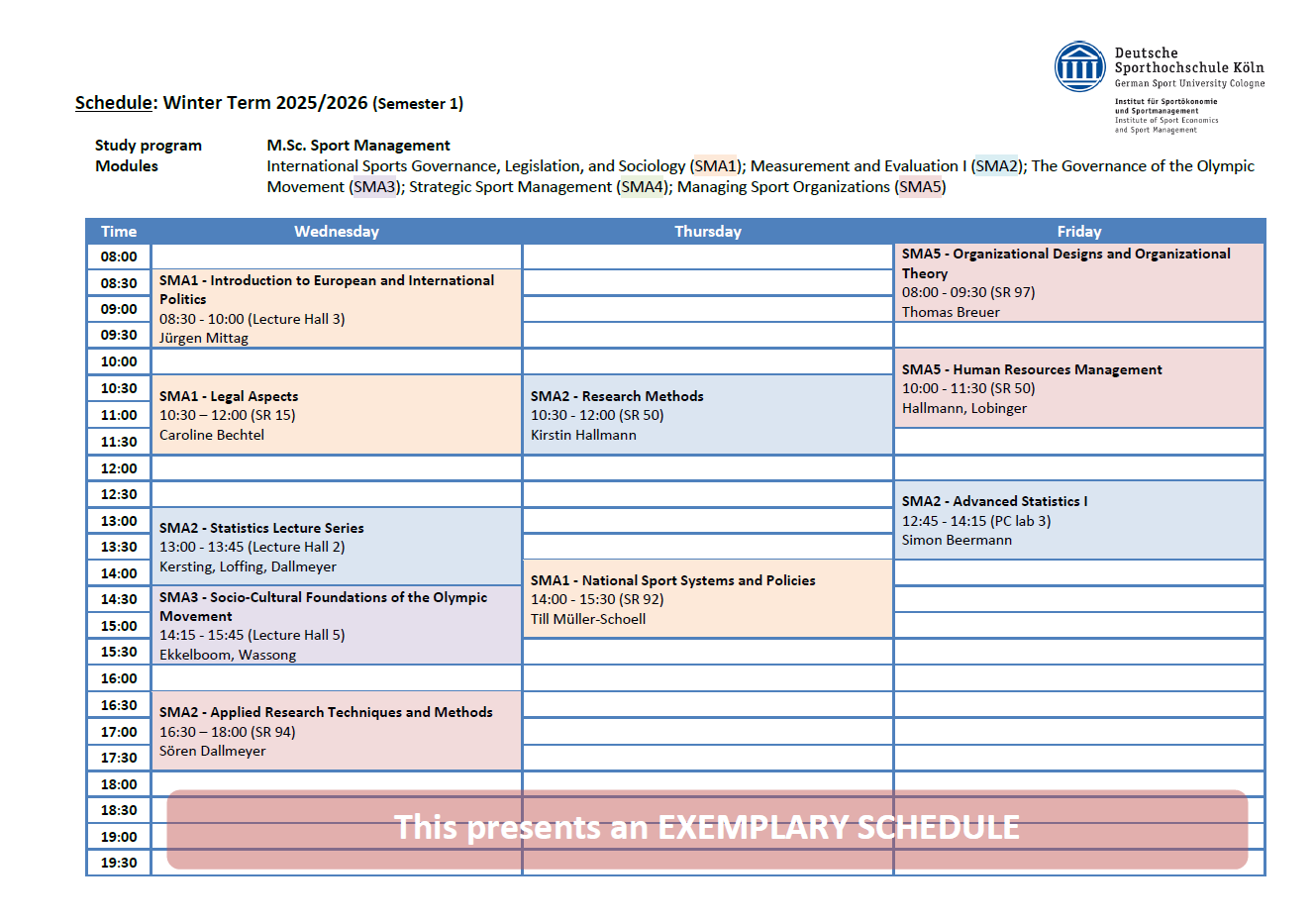 The M.Sc. Sport Management full-time programme spans over four semesters (two years). Classes are typically scheduled for two to three days a week and in compact classes from the first to third semester. The programme is comprised of a total of 12 modules, including the Master’s thesis. Credit points will be awarded depending on the module’s workload, accumulating to 120 credit points.