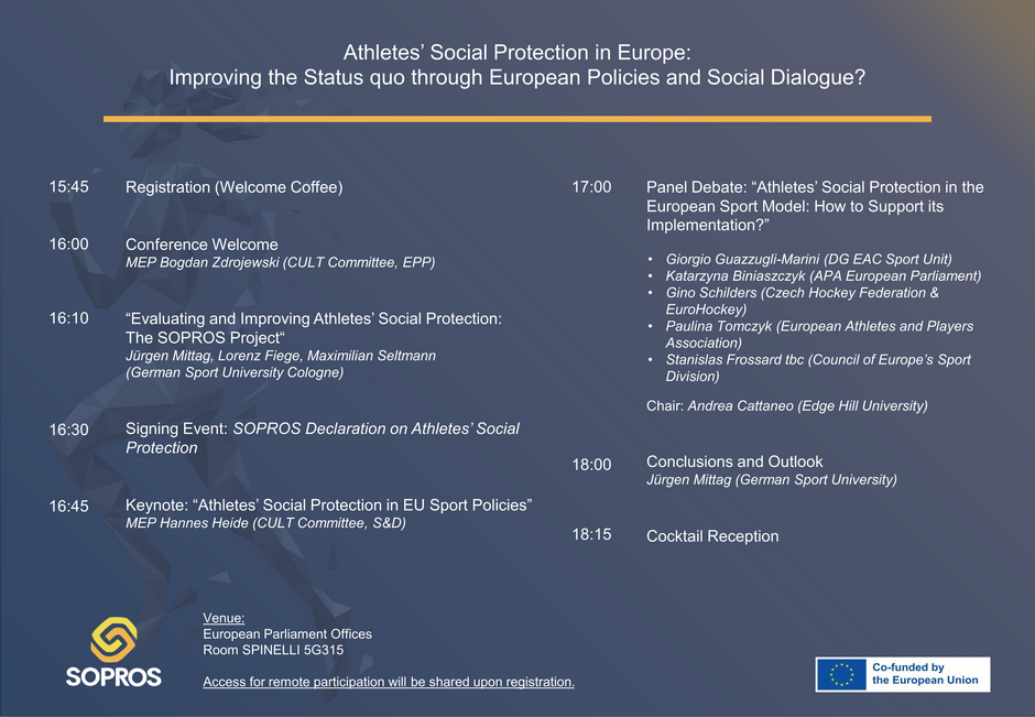 The event will be held under the title “Athletes’ Social Protection in Europe: Improving the Status Quo through European Policies and Social Dialogue?” and will mark the conclusion of the SOPROS project.
