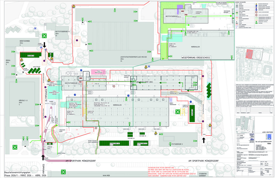 Zum Semesterstart ändert sich einiges auf dem Spoho-Campus; manch eingetretene Pfade können durch die Baustelleneinrichtung nicht wie üblich genutzt werden. Zur besseren Orientierung hier ein paar Hinweise: Auf dem neuen "Steg" entlang des Olympiawegs gelangen Sie zur Mensa und zum Institutsgebäude III (u.a. AStA). Zu den Hallen 21-24 (Nordhallen) und zur Zentralbibliothek der Sportwissenschaften geht es direkt am Pförtnerhäuschen entlang. Fahrräder können wie gehabt vor dem NawiMedi abgestellt werden oder neuerdings auch auf der Rückseite des Hauptgebäudes zur Mensawiese hin. Wenn Sie mit den Rädern auf den neuen Gehwegen unterwegs sind, bitten wir um Rücksichtnahme: Wer sein Rad liebt, der schiebt. Alle neuen Wegführungen sind barrierefrei!