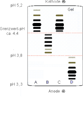 Im Gegensatz zum EPO wandert Darbepoetin im elektrischen Feld zur Anode und wird von gentechnisch hergestelltem rekombinanten (rh) und menschlichen (h) EPO getrennt.
