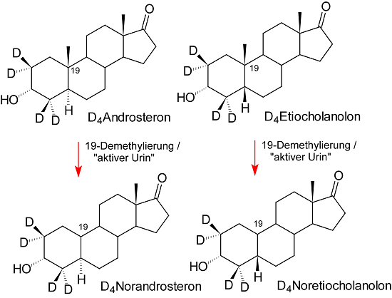 Eine mit Norandrosteron verdächtige Urinprobe wird mit deuteriertem Androsteron und/oder Etiocholanolon versetzt und für über 10 h bei 37°C inkubiert. Kommt es dabei zur Bildung von deuteriertem Norandrosteron bzw. Noretiocholanolon (Abb.8), so ist der Urin "aktiv", und der Befund wird nicht als Dopingverstoß bewertet. Bei dieser Umwandlung entsteht in der Regel prozentual mehr Noretiocholanolon aus Etiocholanolon als Norandrosteron aus Androsteron. Dieses führt dazu, dass das Verhältnis der Testosteronmetaboliten Androsteron (A) zu Etiocholanolon (E) größer ist als das Verhältnis von Norandrosteron (NA) zu Noretiocholanolon (NE). Beispiel bei einer "aktiven Probe": Ist das Verhältnis von A/E gleich 1, dann ist das Verhältnis von NA/NE kleiner als 1 (s.a. Tabelle weiter unten). Nach einer exogenen Zufuhr von Nandrolon bzw. seiner Prohomone ist dieses Verhältnis in der Regel umgekehrt.