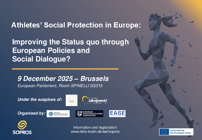 Die Veranstaltung trägt den Titel „Sozialschutz von Sportler*innen in Europa: Verbesserung des Status quo durch europäische Politik und sozialen Dialog?“ und bildet den Abschluss des SOPROS-Projekts. In den letzten drei Jahren hat das SOPROS-Projekt den Stand der sozialen Absicherung von Spitzensportler*innen in fünf europäischen Ländern analysiert und verglichen und dabei Themen wie Beschäftigungsstatus, Zugang zur Gesundheitsversorgung, Rentensysteme und kollektive Vertretung untersucht. Die Abschlusskonferenz bringt Vertreter*innen von Sportorganisationen, öffentlichen Einrichtungen, Wissenschaft und Zivilgesellschaft zusammen, um die nächsten Schritte für eine bessere Koordinierung und einen wirksameren Schutz von Sportler*innen sowohl während als auch nach ihrer sportlichen Karriere zu diskutieren. Im Rahmen der Veranstaltung finden zwei Podiumsdiskussionen zu folgenden zentralen Fragen statt: