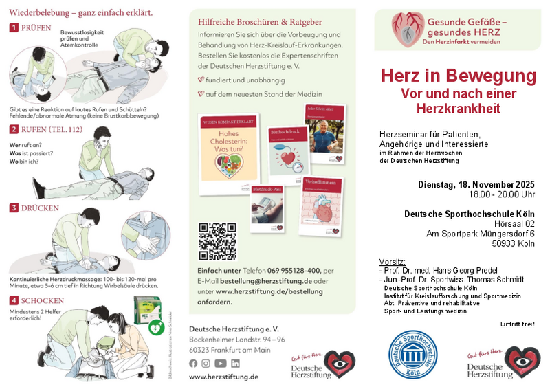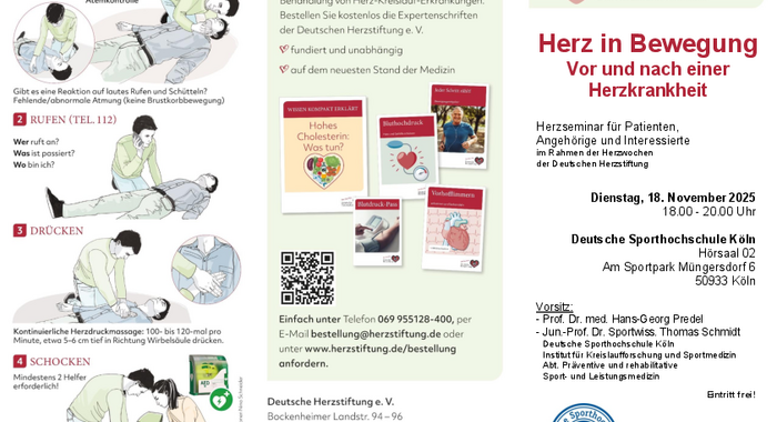 Im Rahmen der Herzwochen der Deutschen Herzstiftung lädt das Institut für Kreislaufforschung und Sportmedizin der Sporthochschule, Abt. Präventive und rehabilitative Sport- und Leistungsmedizin, zu einer Veranstaltung rund um Herzerkrankungen ein.