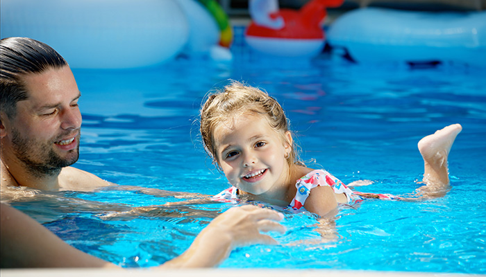 Badebekleidung für die Kinder, Handtücher, Trinkbares für danach, Badebekleidung für begleitende Erwachsene, 2-Euro-Stück für einen Spind.